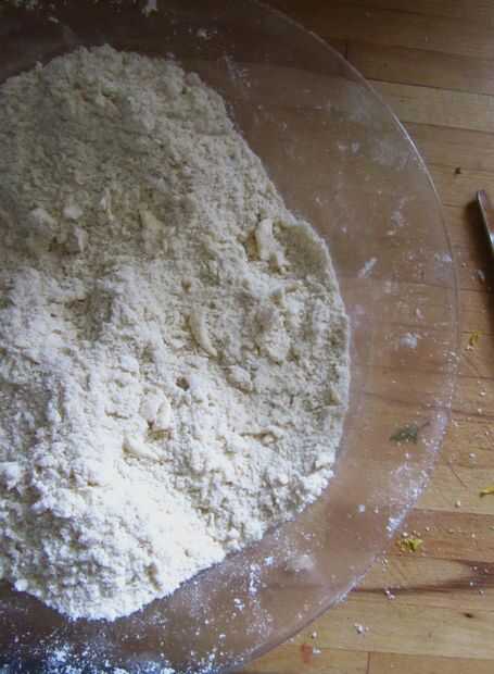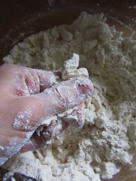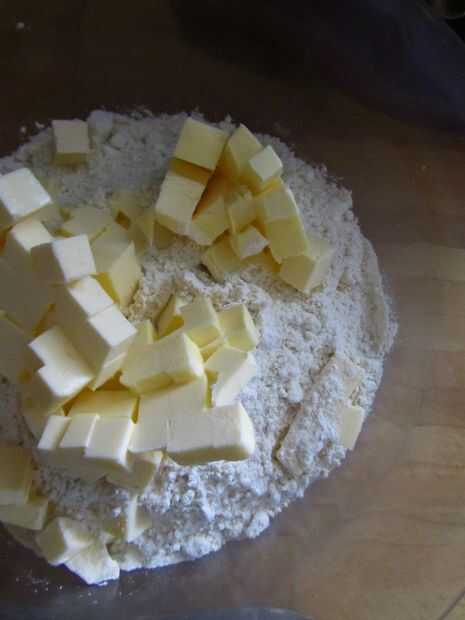 Cortar la mantequilla en trocitos y añadir a la harina. Frote la mantequilla en la harina con los dedos hasta que la mezcla se parece a pan rallado fino. Esto distribuye la mantequilla en la masa, dando una buena textura escamosa.