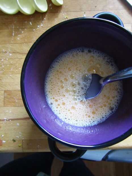 Bata las yemas de huevo y agua fría. Mezcla estos juntos antes de mano detiene la masa obteniendo rayas cuando se agregan los huevos.
