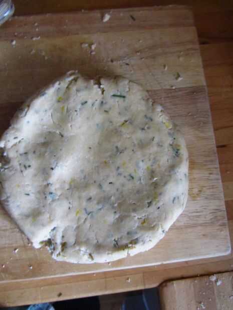 Una vez que se presiona la masa juntos en una bola aplanarlo en un gran disco. Envolver en film transparente y enfriar en la nevera por una media hora a firma para arriba.