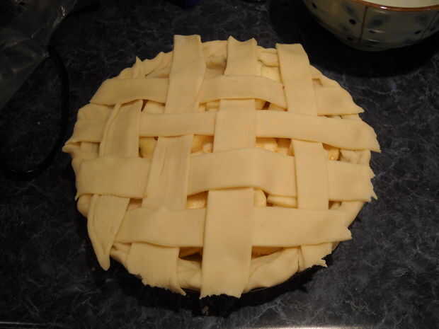 Tomar la segunda masa de empanada y rebanada en incluso las líneas, se trata de la parte superior de nuestro pastel. A ser tejido de tal manera que se asemejan a un enrejado.