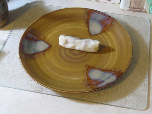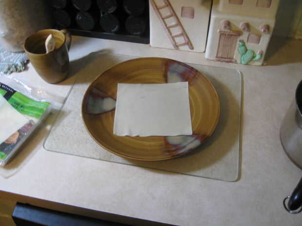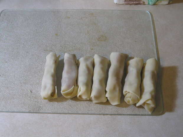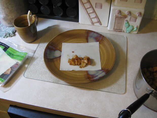 Pone un abrigo y cepillo con la clara de huevo (o agua).  Poner aproximadamente dos cucharadas de manzanas en la envoltura y ruede para arriba, recordando a tuck en los extremos.