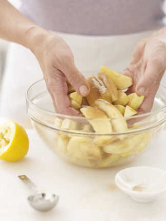 Lugar en un recipiente grande con el jugo de limón y espolvorear con la canela y 2 cucharadas del azúcar y sorteo.