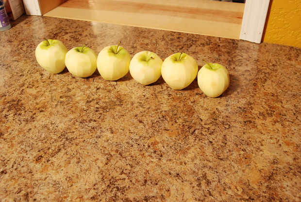 Pelar las manzanas y cortarlas en rodajas finas. Fácil de hacer usando un pelapapas y un cuchillo. 6 manzanas de tamaño medianas deben ser suficiente, pero otra vez, que es una aproximación.