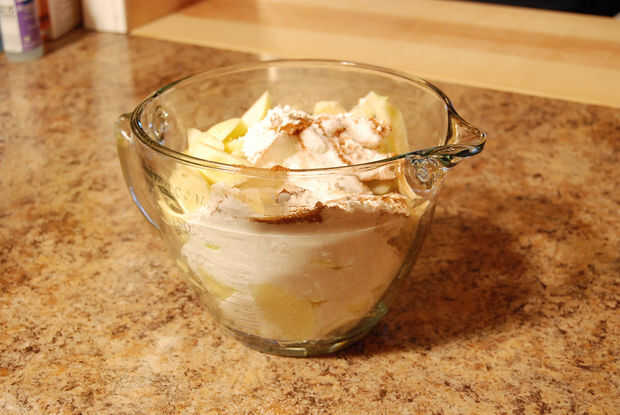 Comino las manzanas en rodajas con el azúcar, harina, canela, nuez moscada, jugo de limón y sal en un tazón grande y mezclar hasta que todos los sectores están relativamente bien cubiertos.