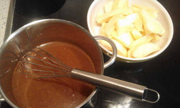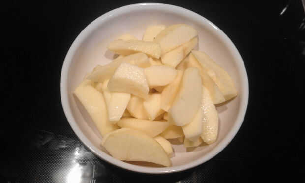 Pelar las manzanas y cortarlas en rodajas. Poner en un bol y agregar 2 cucharadas de jugo de limón. Ponga a un lado.