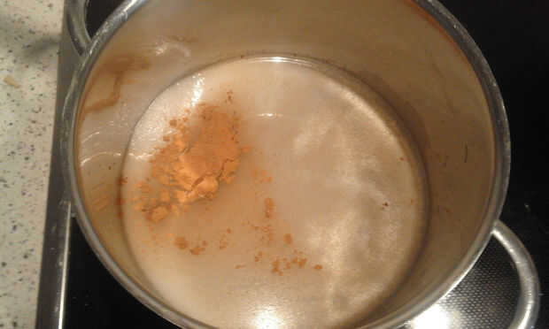 Ahora poner 1 taza de azúcar, la canela y una pizca de sal en una olla y se deja hervir por 2 minutos revuelve todo el tiempo. Dejamos que se enfríe un poco.
