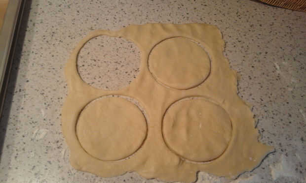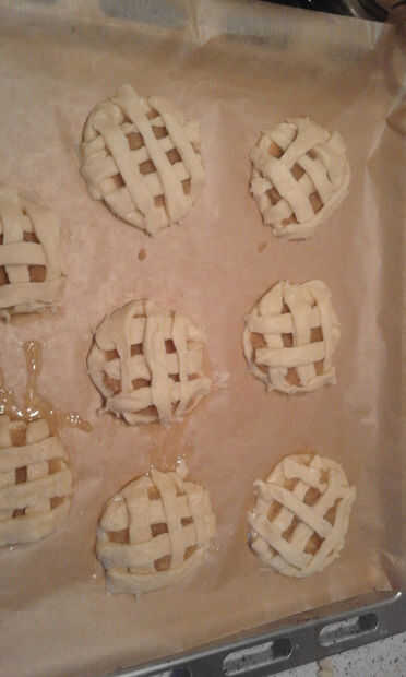 Utilizar la mitad de la tarta. Rodillo hacia fuera y luego cortar círculos. Hice círculos con un vaso grande pero puede hacerlos más pequeños o más grandes como quieras. En lugar de muchas pequeñas tartas puede hacer una empanada grande, también.