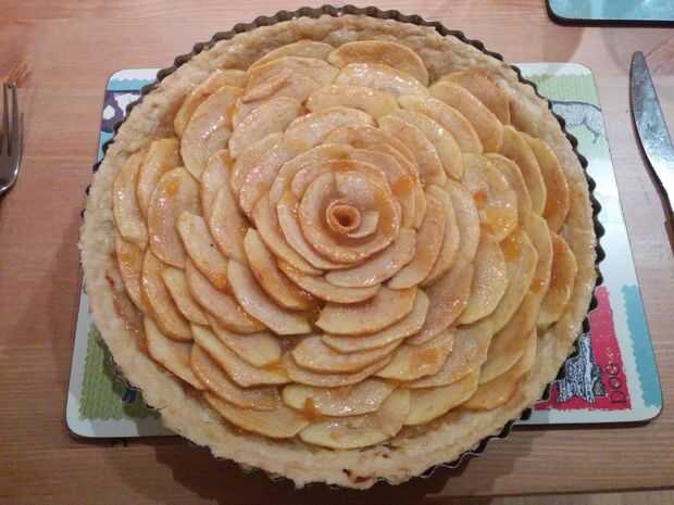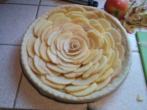 Una vez tiene su corteza de tarta al horno ciego y refrescado un poco puede propagar su puré sobre él. Entonces a partir del borde exterior lentamente Coloque las láminas de manzana en el exterior asegurando que se solapan ligeramente entre sí. Seguir construyendo esta espiral hasta llegar al centro. Una vez en el pliegue de centro la rebanada más delgada de la manzana puede en un círculo y coloque en el centro para formar el centro de la flor. Espolvorear con un poco de azúcar.