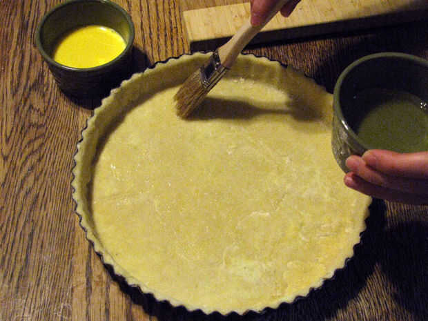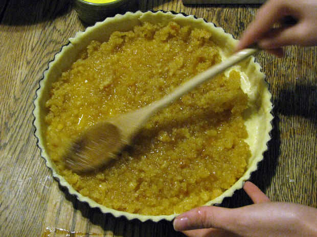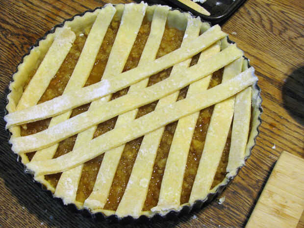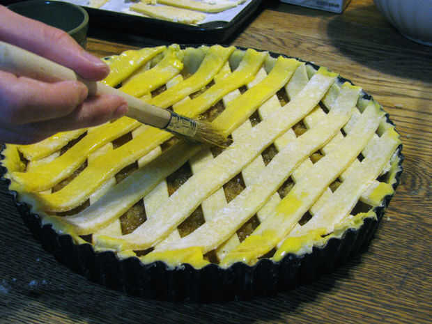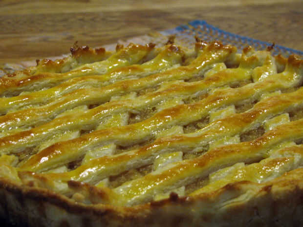 Pincelar la masa de tarta en el molde con clara de huevo. Verter y repartir incluso la melaza relleno sobre él. Capa de las tiras de masa de hojaldre en la parte superior aproximadamente 1/2" de distancia en paralelo, recorte los bordes a medida que avanza. Hacer una segunda capa del mismo modo, ya sea perpendicular a la primera capa o en otro ángulo para crear un efecto diamante. Batir la yema y la crema y cepillar la corteza superior. Hornear durante 20-25 minutos, hasta que la corteza superior es marrón de oro. Si utiliza un molde de tarta con fondo removible, hornear sobre una bandeja forrada con.