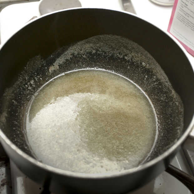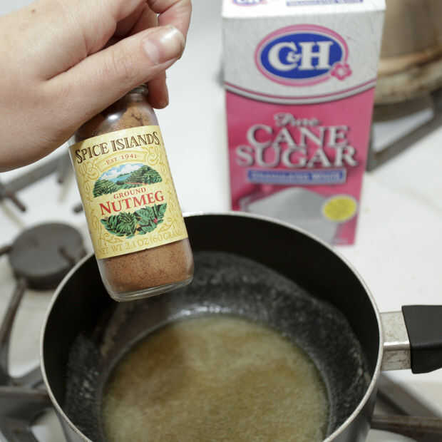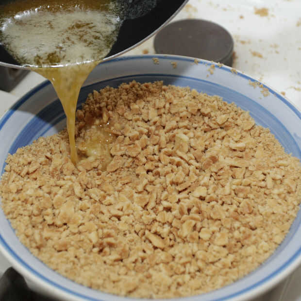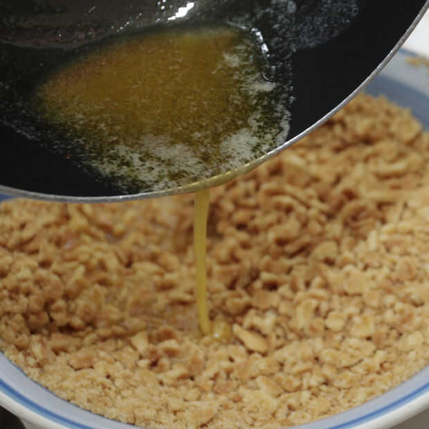 Derrita 6 cucharadas de mantequilla y mezclar en el azúcar y la nuez moscada. Vierte la mezcla sobre tus migajas.