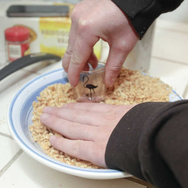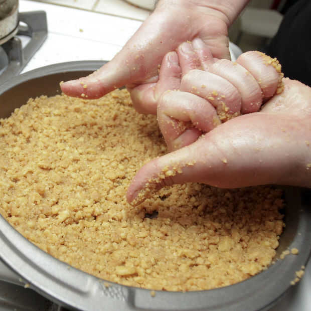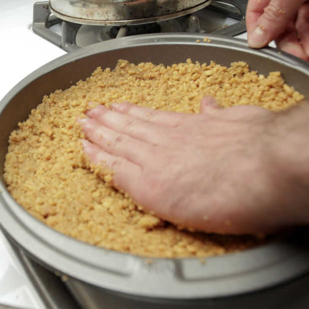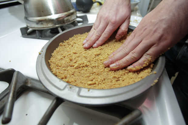 Presione la mezcla en el molde engrasado y dejar de lado. (Nosotros sólo atascado unas galletas extras allí para la buena medida)