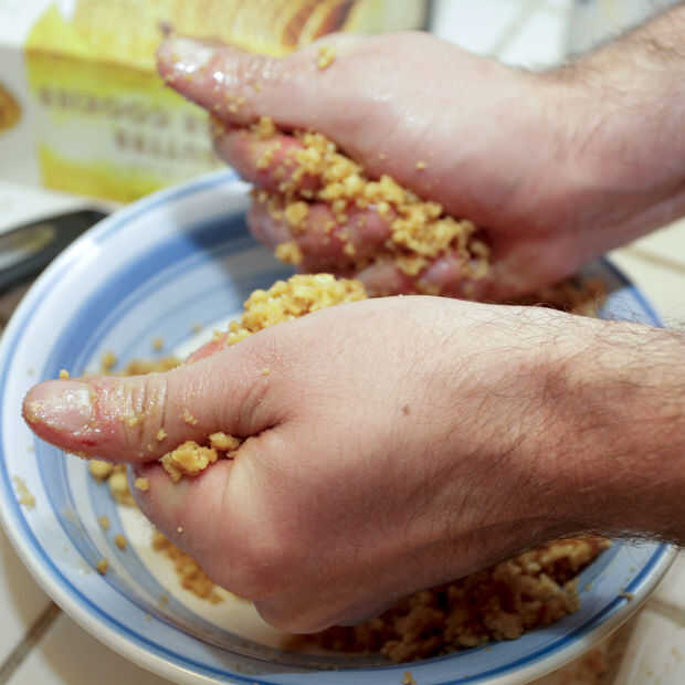 Hemos intentado horquilla juntos todas las migas de mantequilla mezcla, pero es mejor llegar allí con las manos a mush todo.