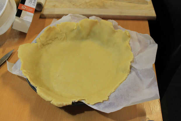 Estirar la masa a 3mm de espesor. Transferencia en la bandeja de empanada y recorte los bordes. Mantenga los recortes para adornar después la corteza.