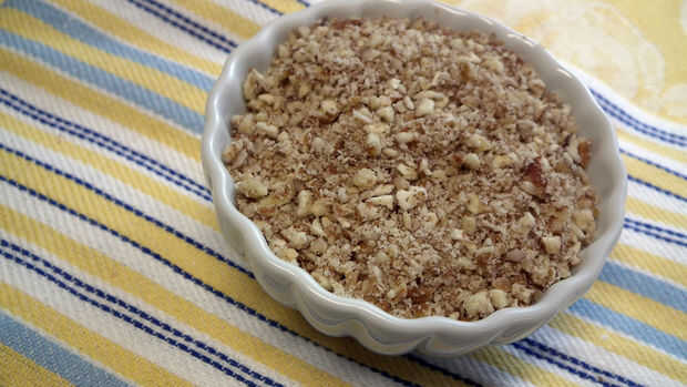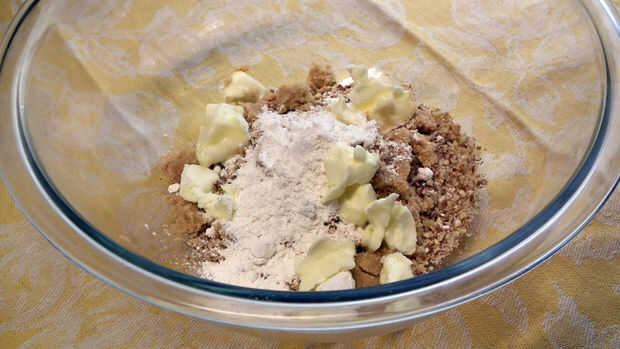 1. En un tazón grande, combinar la harina, la azúcar, la mantequilla fría y nueces.