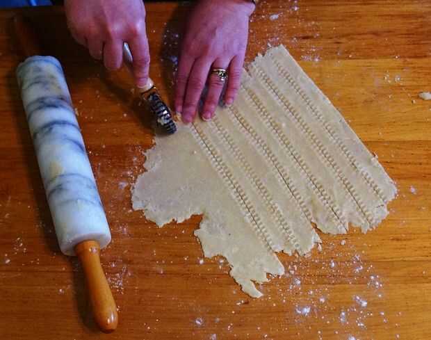 a. estirar la masa de la corteza superior hasta que sea aproximadamente 3/16"(aprox. 5 mm) espesor.  No tiene que ser todo este tiempo, de hecho es mejor un rectángulo.  Cortar en tiras 1/2 pulgada (13 mm) de ancho con un cuchillo o un cortador de pasta rodando.
