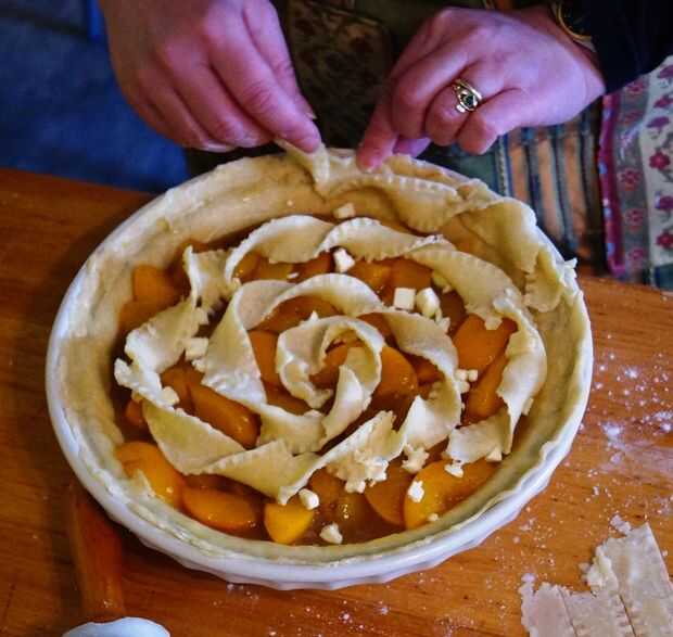 Al comenzar a correr fuera de la tira de la pasta, coger otra y pellizque un extremo junto con el final de la primera; Humedezca ligeramente las puntas con algunas de la colada del huevo si es necesario para conseguir que pegar. Puede realmente necesita cuatro manos para lograr esto fácilmente. Mantenga establecen las tiras de masa retorcida en espiral hasta que tiene cinco o seis círculos – pero parada corto del borde real de la empanada.