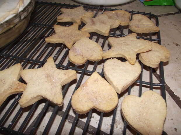 • Después de todo esto si tienes alguna ambición a la izquierda, usted puede tomar el resto de esa tarta sobra y ruede hacia fuera y utilizar algunos cortadores de la galleta y cortar algunas formas. Espolvorear con canela y azúcar y hornee a 350 hasta que doren. Ahora tienes unas galletas deliciosas para mantener a todos satisfechos hasta que el pastel haya enfriado.