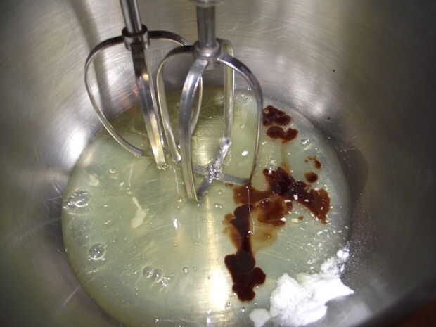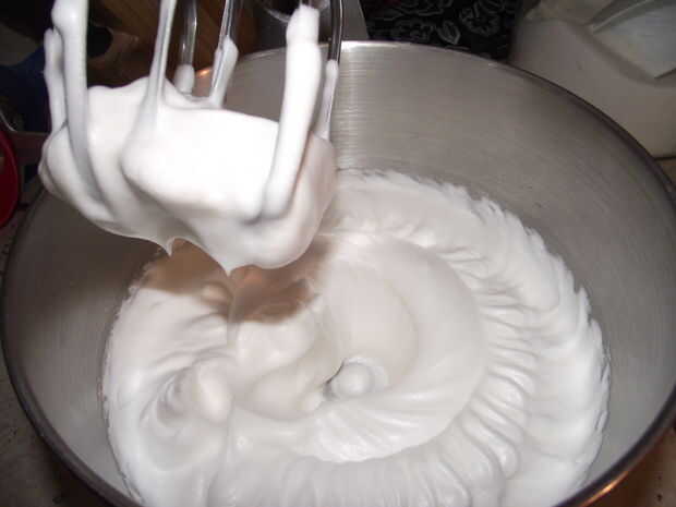 • En una gran mezcla bowl: combine las claras de huevo, la vainilla y la crema tártara. Batir hasta que formen picos. Ahora poco a poco agregue el azúcar.