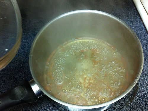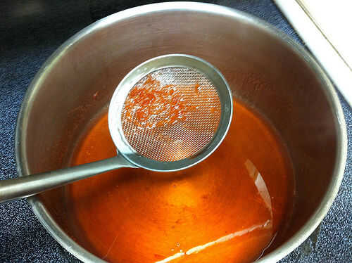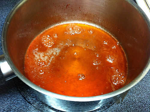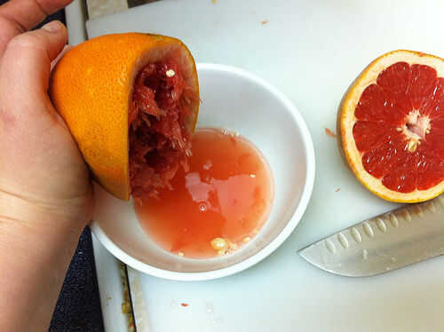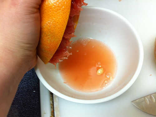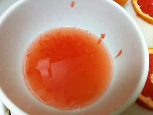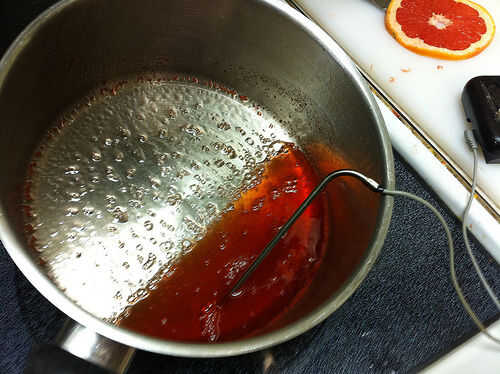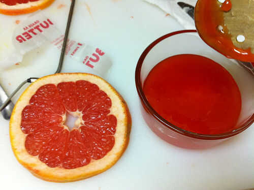 Exprimir el pomelo de la mitad restante en una olla. Esto debería darte acerca de 1/2 C jugo. Añadir el azúcar y el jarabe de maíz y llevar a ebullición, revolviendo ocasionalmente. Coloque la tapa sobre la olla y hervir por 3 minutos para que el vapor puede Lave los cristales de azúcar en el lado de la olla. Añadir la mantequilla y seguir cocinando a fuego medio.