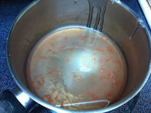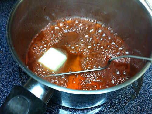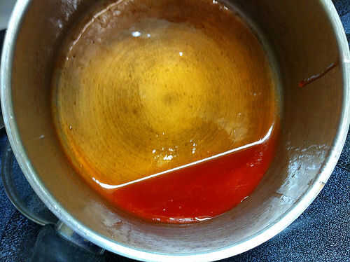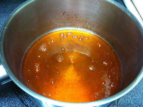 Puede mantener hielo agua cerca. Cocinar el caramelo hasta que quede sólo un poco más delgado que usted desea cuando usted cae en agua con hielo. Creo que aproximadamente 225 F grados es una temperatura buena para este caramelo para utilizar como topping. Si quieres tuya más delgado y más fácil de esparcir, cocinar a una temperatura más baja.