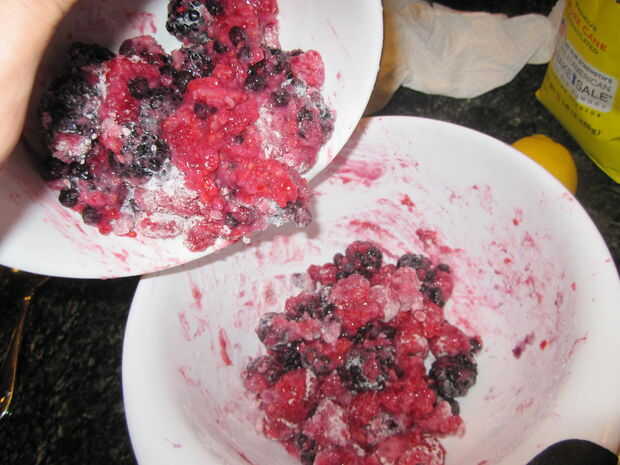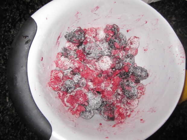 Vierta la mezcla de almidón de maíz/harina de azúcar en las bayas (imagen 2).