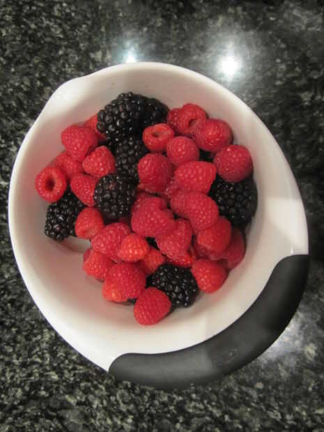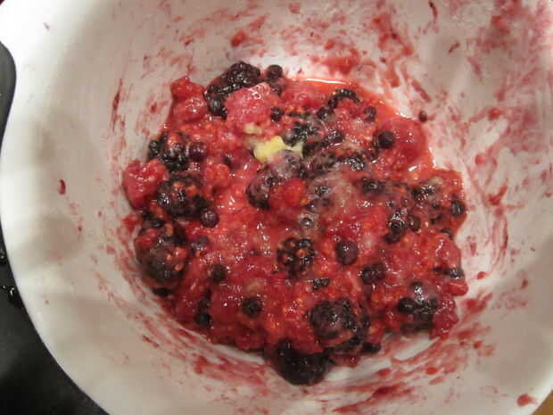 Agregar 3 tazas de bayas en un recipiente diferente. Los arándanos están ahí, justo en la parte inferior (imagen 1).