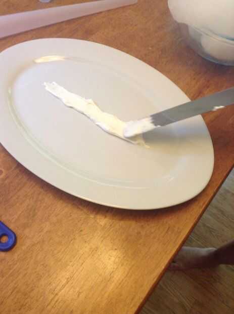 Para mantener la torta en su lugar y evitar que cualquier lugar es esencial para una línea de 1 1/2 pulgada de helar en el centro del plato de presentación se utiliza.