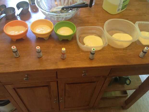Colocar los siete tazones de fuente en una línea con el colorante correspondiente para eso tazón de fuente. A continuación, cuchara la masa en cada recipiente. No se olvide de sacar la misma cantidad en cada recipiente. A continuación poner una gota de colorante en su recipiente correspondiente. Luego se mezclan! :)