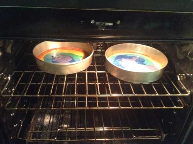 Un método simplificado de hacer un pastel de arco iris con tan sólo dos latas para hornear.Fondo:Tontamente intenté hacer un pastel de capas de arco iris para la 7 º fiesta de cumpleaños de mi hija recientemente.Resultó OK (ver segunda imagen). Fue u