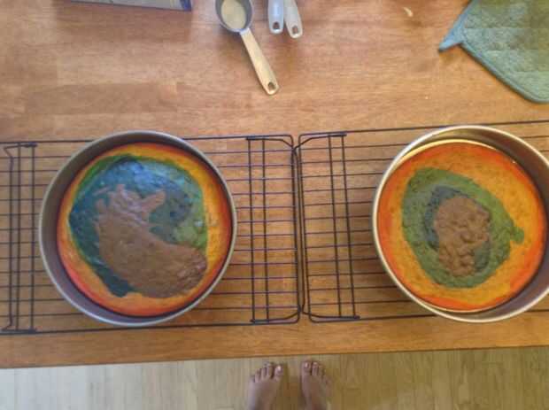 Un método simplificado de hacer un pastel de arco iris con tan sólo dos latas para hornear.Fondo:Tontamente intenté hacer un pastel de capas de arco iris para la 7 º fiesta de cumpleaños de mi hija recientemente.Resultó OK (ver segunda imagen). Fue u