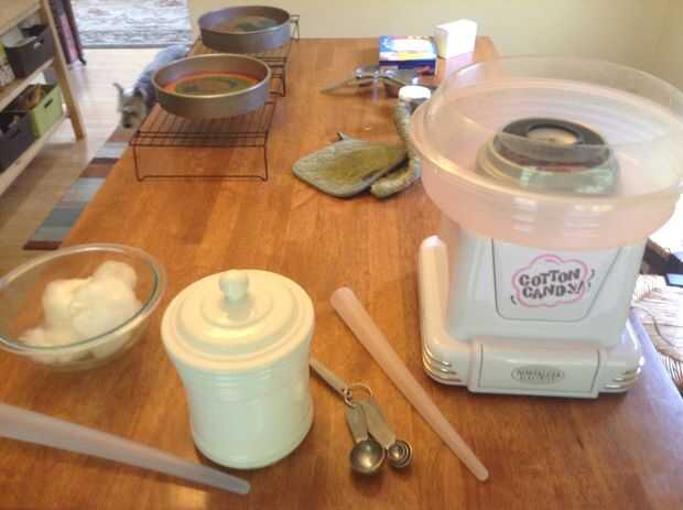 Para hacer algodón de azúcar necesita una máquina de algodón de azúcar. Este es de Nostalgia Electronics y es menor de $50. El debe dejar el calor de la máquina de algodón de azúcar antes de añadir el azúcar. Usé azúcar blanco viejo llano para hacer el algodón de azúcar. No necesitas hacer mucho sólo lo suficiente para poner en los extremos del arco iris.