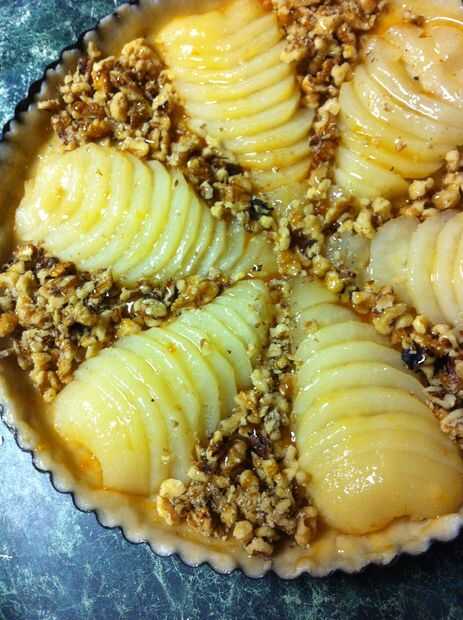 Añadir las nueces entre las rodajas de pera, esparcirlas cuidadosamente. Cepillo el restante