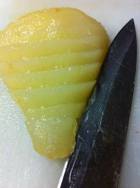 de un cuchillo debajo de la pera en rodajas medio, mantener las rebanadas todos juntos. Establecer la