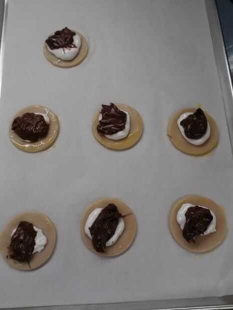Vierta una cucharada de la pelusa de la melcocha y una cucharada de Nutella en el centro de cada círculo (usar un set de cuchillo espátula o mantequilla para el relleno)