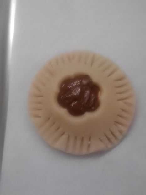 Uso pequeños cortadores para cortar una forma de cada resto del círculo y luego top cada círculo lleno con el círculo con el corte hacia fuera. Luego, doble los bordes con un tenedor. Cepille la parte superior con el lavado de huevo y cubra con la forma de la masa sobrante.