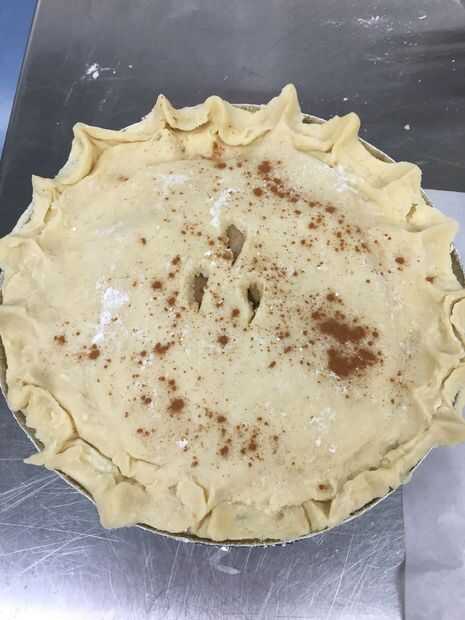 Tomar la segunda mitad de la tarta y rodar hacia fuera en un círculo de 1/4 de pulgada de espesor. Estar seguro que es aproximadamente una pulgada más grande que la parte superior de su bandeja de pie todo el camino alrededor. Colocar la tarta encima de la tarta y doblar los bordes. Cuidadosamente con un cuchillo afilado para cortar tres agujeros de forma de lágrima que cayó en el centro y el polvo de canela si se desea.