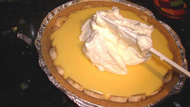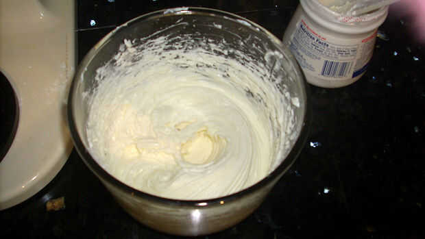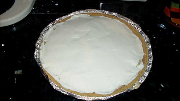 Mezcla el queso crema con el contenido de la jarra de malvavisco crema hasta suave, siente libre de mezclarlo bien, alta velocidad funciona bien. La mezcla se calienta la crema y facilitan la masa suavemente en el centro del pastel y difundir hacia el exterior hacia el borde y hasta la corteza de galleta.