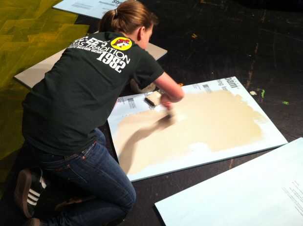 Después de comprar la espuma de poliestireno aislamiento y corte en 4 piezas de 3 x 2 pies, primera de las cuatro piezas con una delgada capa de pintura y pegamento junto con clavos líquidos. Si no pones el primer, que los clavos líquidos comen a la espuma. Después de preparar, dejar que la pintura seque completamente (hemos utilizado un ventilador)