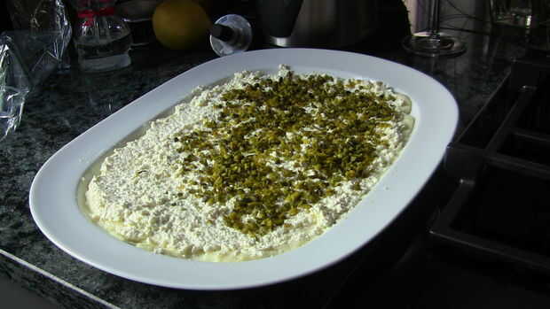 Para decorar el Halawet El Jibn, tome pistachos pequeños y colóquelos en la parte superior sobre la superficie del postre. Asegúrese de dejar una cierta área de pistachos como algunas personas evitar pistachos o están alérgicos a ellos.