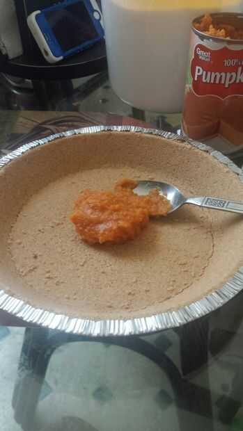 ¿He utilizado una cuchara de sopa, ya que necesita las medidas? Sólo recogió algunas calabazas de la lata y dejó caer sobre la corteza. Usted podría utilizar más o menos, dependiendo de la profundidad de su corteza, o cuánto desea el pastel a gusto de calabaza deliciosa. Terminé usando dos toques.