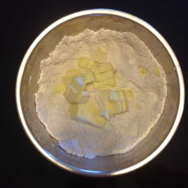 Medir 125g de mantequilla, cortar todo de mantequilla en cubos de aproximadamente 1 cm y mezclar en la harina. Cortar la mantequilla en la harina con un cortador de pastelería o con un tenedor, hasta que la mezcla se asemeja a escamas de pan grueso.