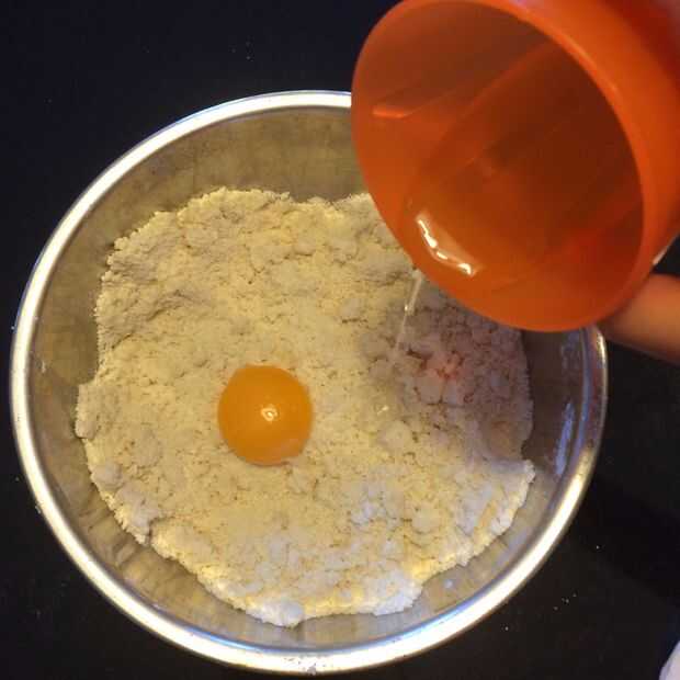Añadir sobre 3Tbs de agua a la mezcla y empezar a doblar la mezcla juntos.
