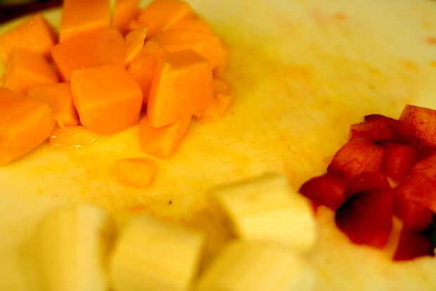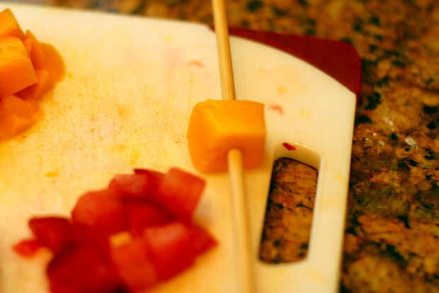 Cubo y rebanada de la fruta una vez que se ha congelado la mezcla de cheesecake. Sacar la mezcla del cheesecake en bolas y alterno con poner las bolas de frutas y tarta de queso en pinchos. Mantenerlos congelados hasta que se les sirva.