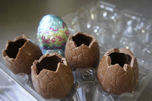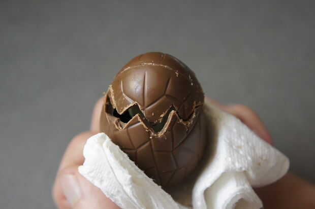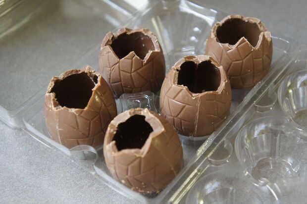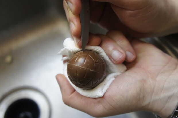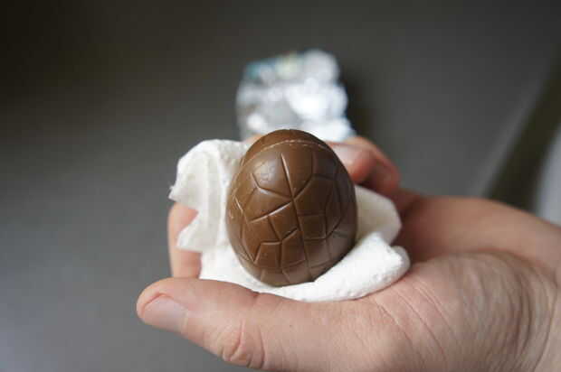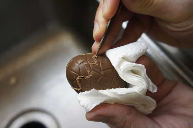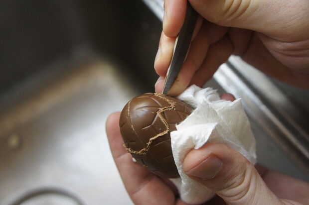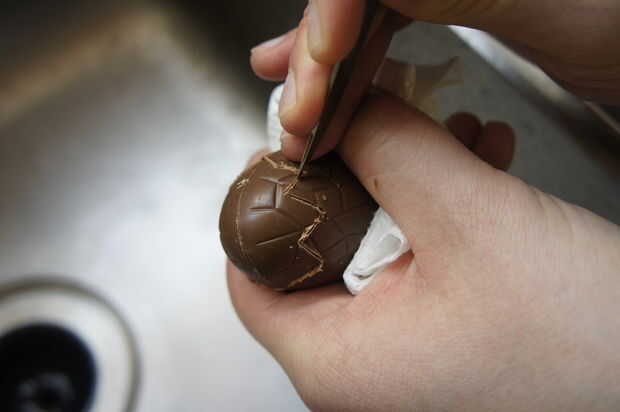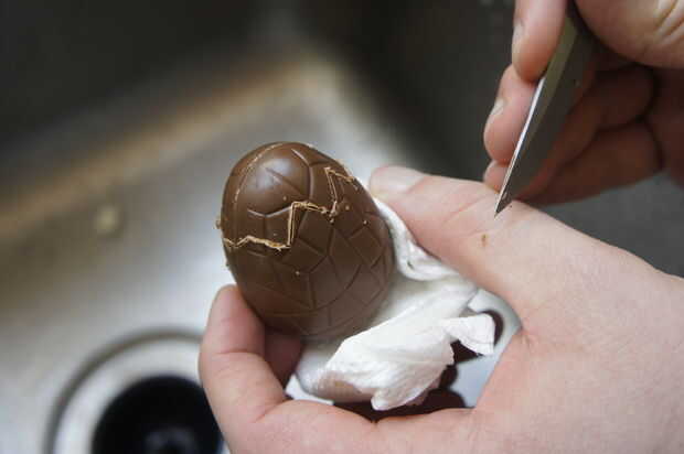 Colocar un huevo de chocolate en la mano y sujétela con una toalla de papel. Usando un cuchillo de sierra, trazar ligeramente los bordes irregulares que desee para su huevo de chocolate. Trazar sobre ella una vez más, un corte más profundo en el huevo de chocolate y remover la parte superior cuando te fuiste completamente alrededor de la parte superior del huevo.