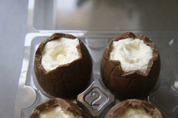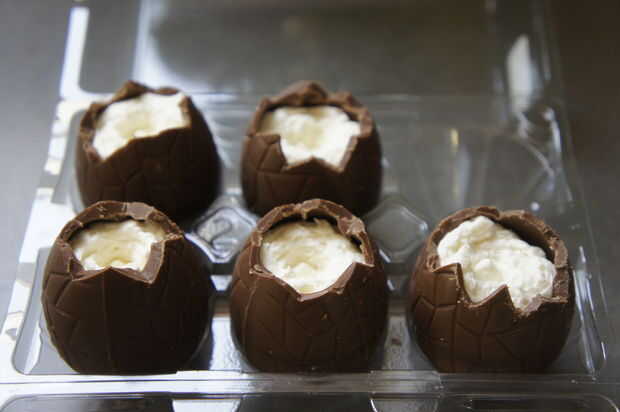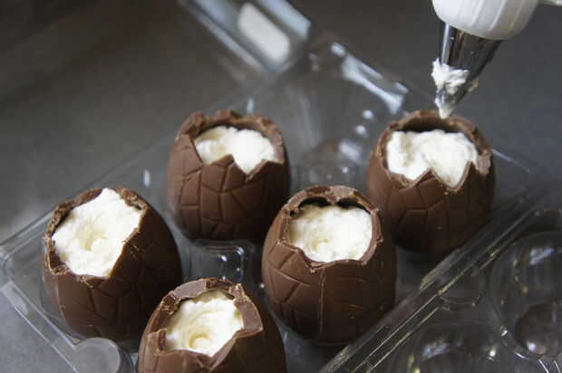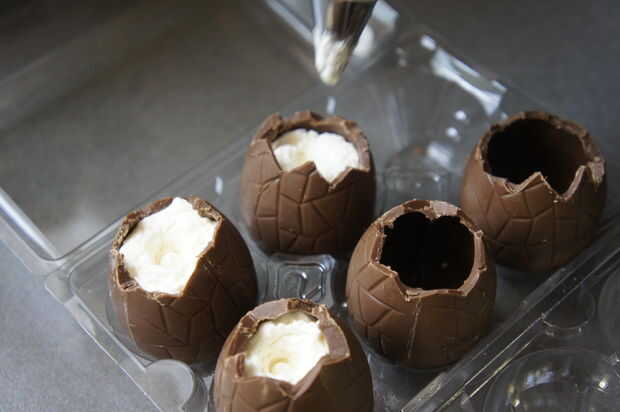 Usando un bolso de la pipeta, tubo la tarta de queso a los huevos de chocolate hueco. Llenarlos hasta la parte superior, dejando una inmersión poco profunda en el centro.