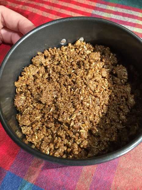 Mezclar el pozo de petróleo en las migas y embalar firmemente en la base de un molde springform. Dejar en la nevera.