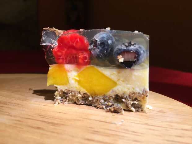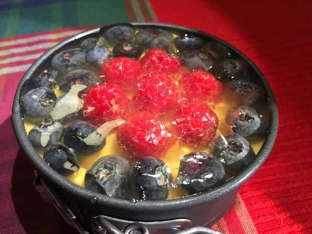 Coloque frutas encima de la capa de queso ya establecido. Preparar la solución de miel. Agregue la gelatina a la misma. Mezclar bien. Vierta sobre las bayas. Tapar y dejar en la nevera.