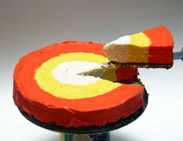Cuando se corta, es mejor empuje la cuchilla hacia abajo en el pastel y a través de la corteza y luego subir hacia atrás. Si arrastrar el cuchillo hacia usted o meneo en la torta, te manchan los colores!