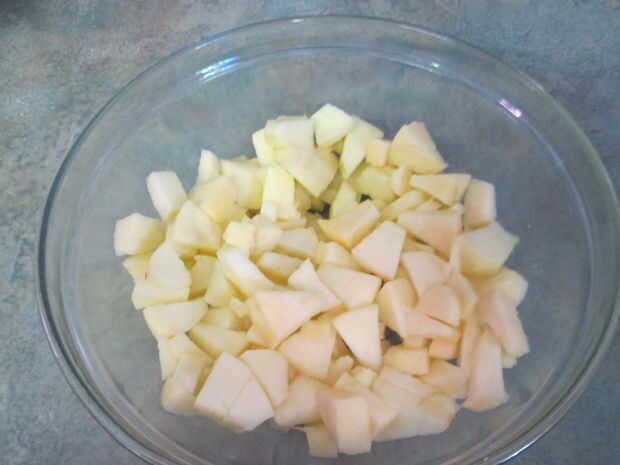 Pelar, base y cortar las manzanas en trozos pequeños y colocar en un bol.