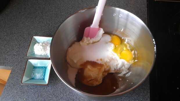 2) Coloque el yogur griego, el huevos, el azúcar y la vainilla en un tazón. Mezclar bien, preferiblemente con una batidora eléctrica. Añadir el almidón de maíz y sal y continuar mezclando bien.
